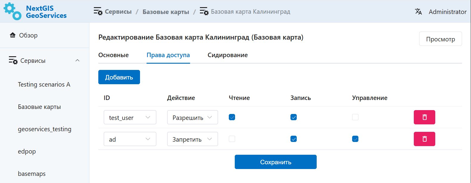 Если у вас несколько пользователей, которые должны иметь доступ к NextGIS GeoServices, можно настроить для них права доступа.