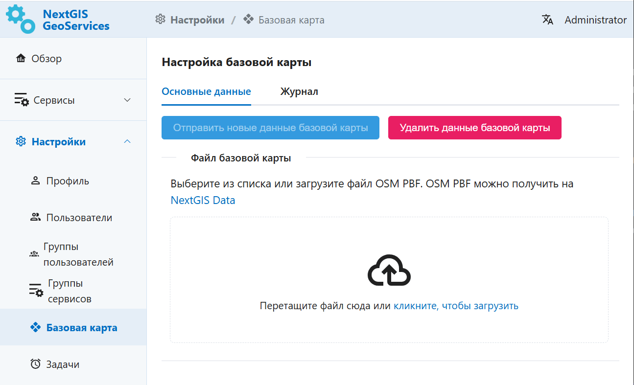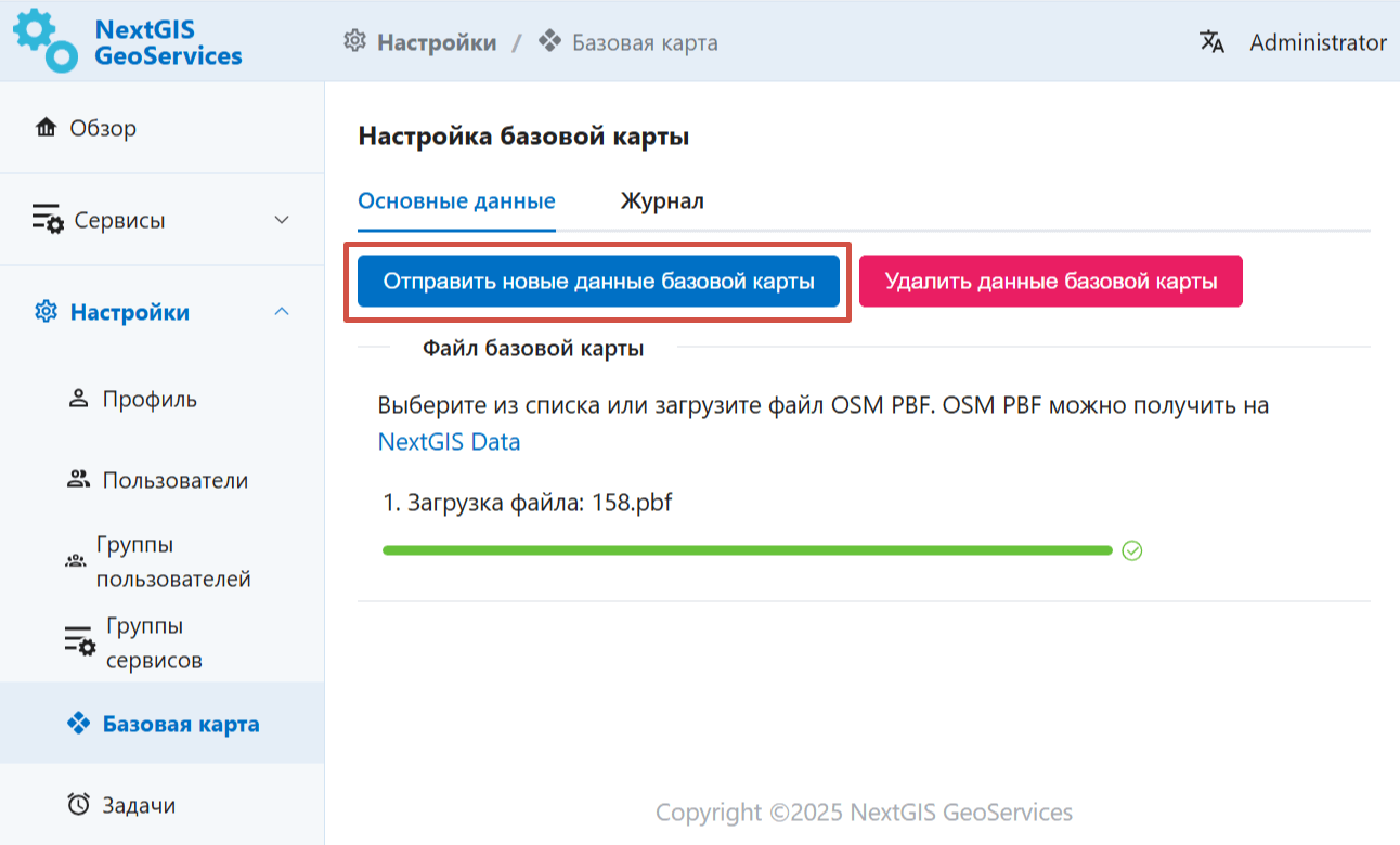 Когда данные загружены, нажмите Отправить новые данные базовой карты. Это запустит процесс формирования тайлового сервиса на их основе.