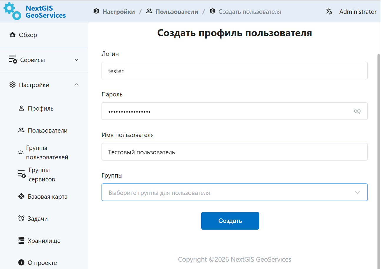 Рис. 9.28. Создание нового пользователя в NextGIS GeoServices on-premise¶