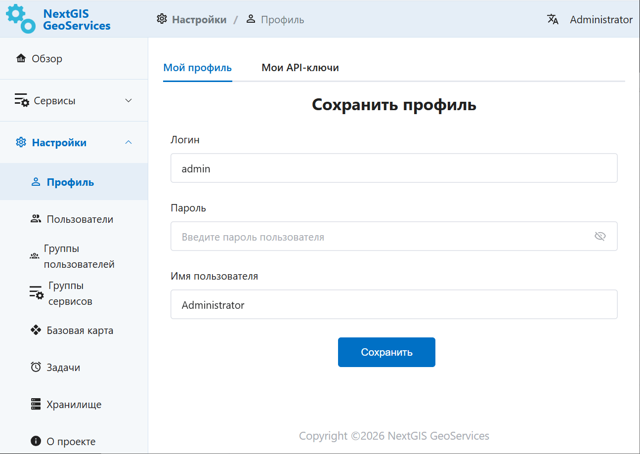 Рис. 9.17. Раздел «Мой профиль» в NextGIS GeoServices on-premise¶