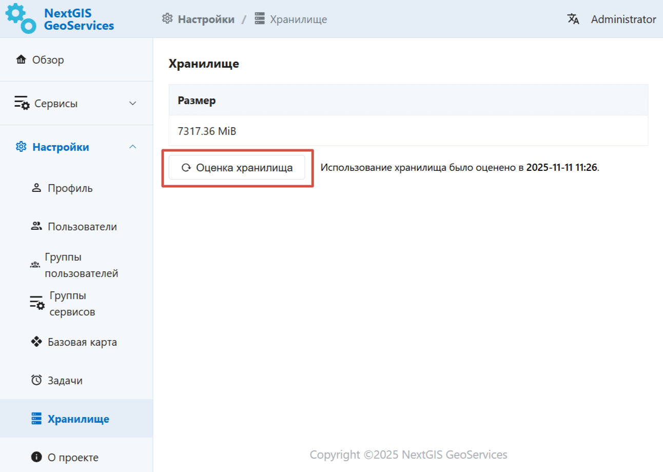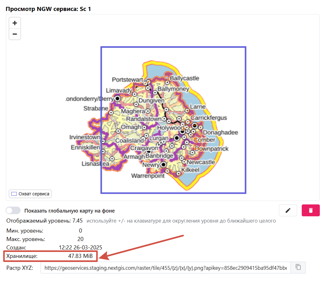 Оценка занимаемого места производится не только для хранилища в целом, но и по отдельным сервисам. Эта информация отображается в режиме просмотра сервиса перед ссылкой на тайлы.