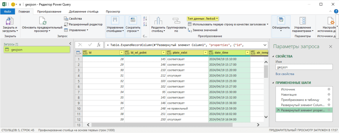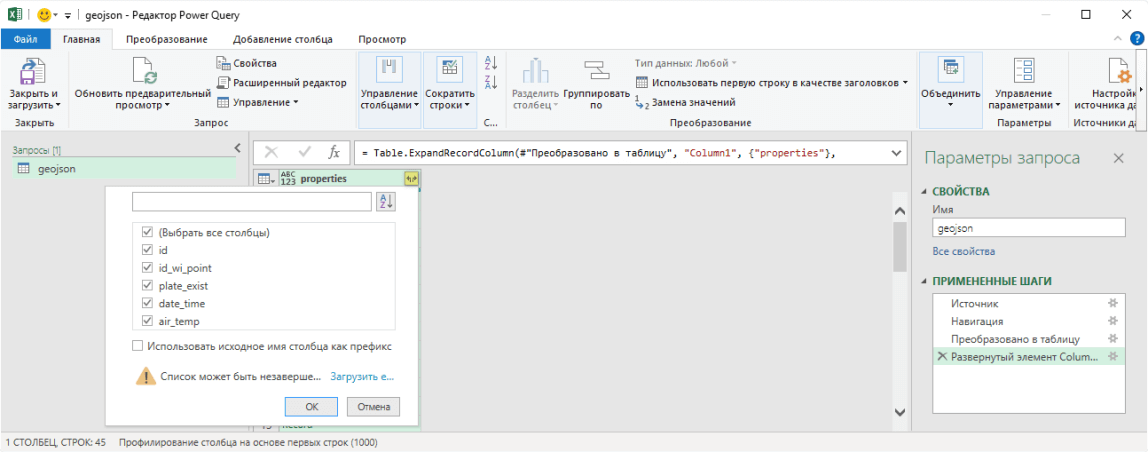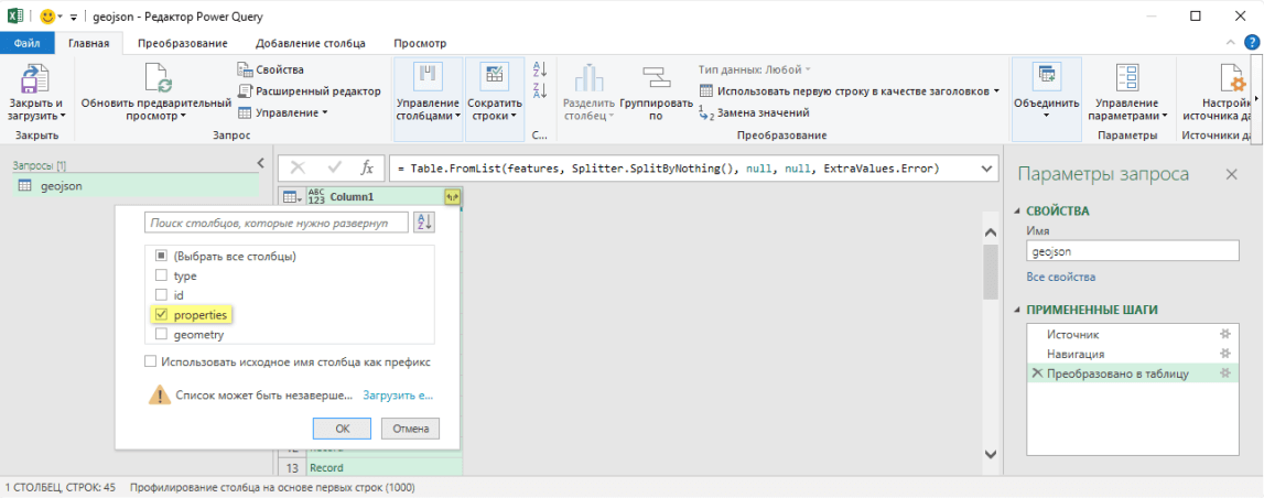 Полученный элемент «properties» необходимо развернуть далее в двумерную таблицу.