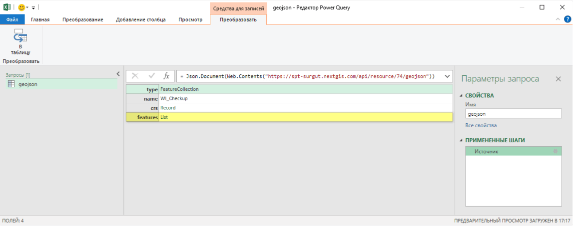 Далее запустится окно редактора Power Query, в котором настраиваются дальнейшие шаги получения данных. Данные находятся в списке «features: List». Нажмите на «List», чтобы перейти к списку.