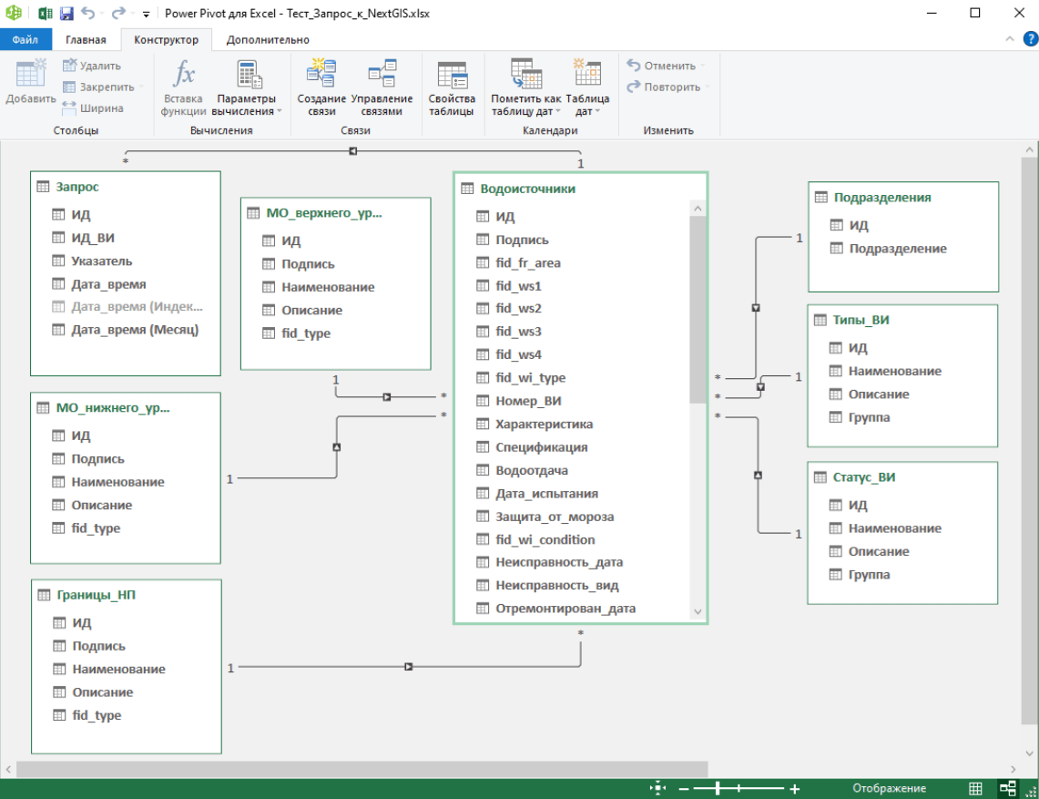 В одном файле Excel можно настроить несколько запросов к ресурсам NextGIS Web. Если данные ресурсы связаны между собой, то необходимо настроить связи между ними и в файле Excel. Данную настройку должен выполнять пользователь: