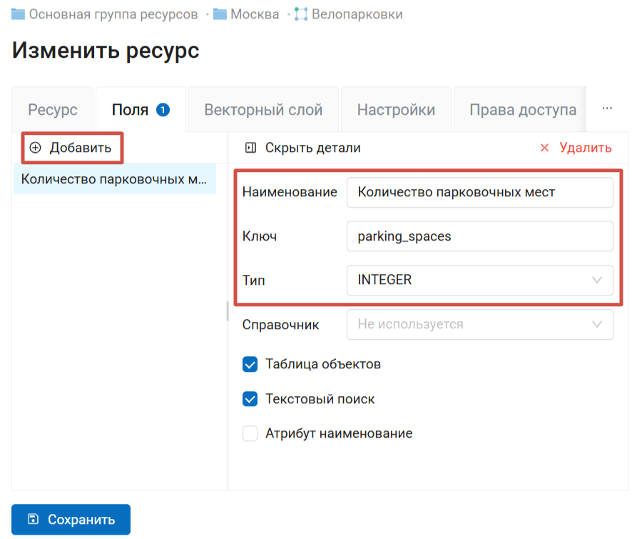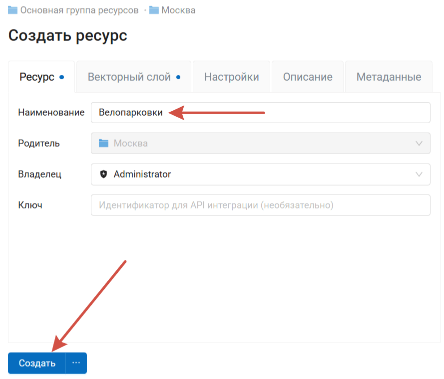 На вкладке Ресурс задайте имя для нового слоя, например Велопарковки, и нажмите кнопку Создать.