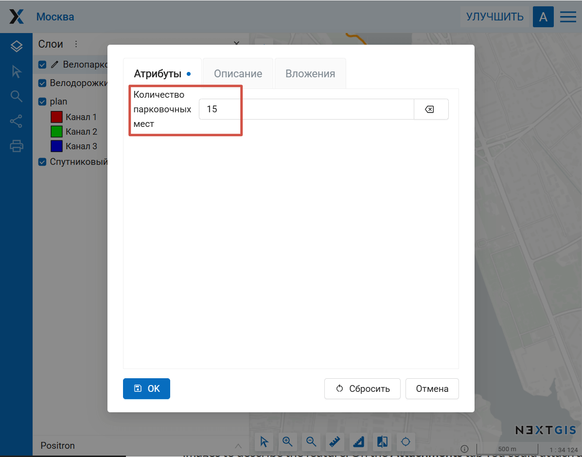 Появится всплывающее окно, где вы можете задать значения атрибутов, например количество парковочных мест - 15.