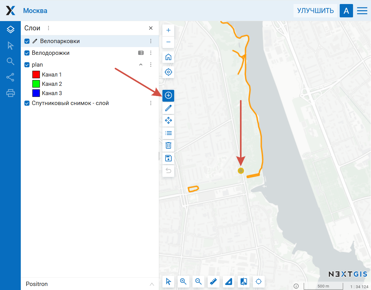 Теперь на карту добавлен новый векторный слой и включена возможность редактирования слоёв. Откройте