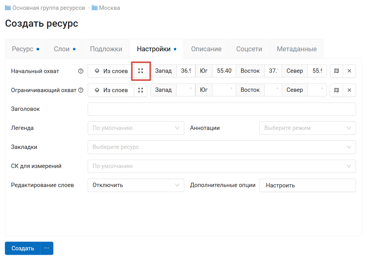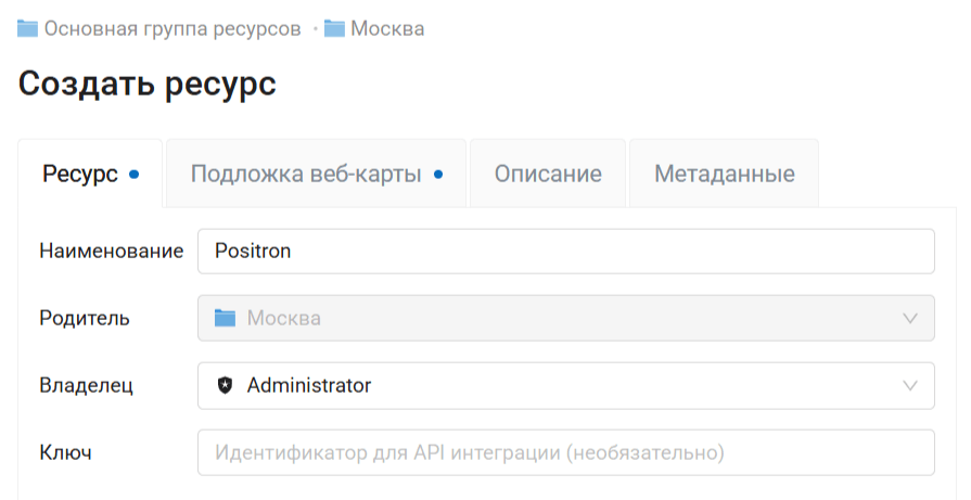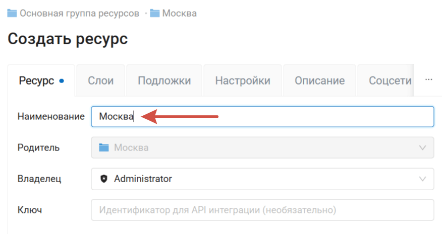 У веб-карты много разных настроек. На вкладке «Ресурс» введите наименование карты, например, Москва.