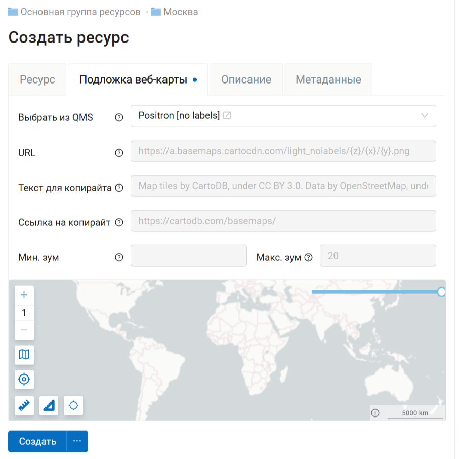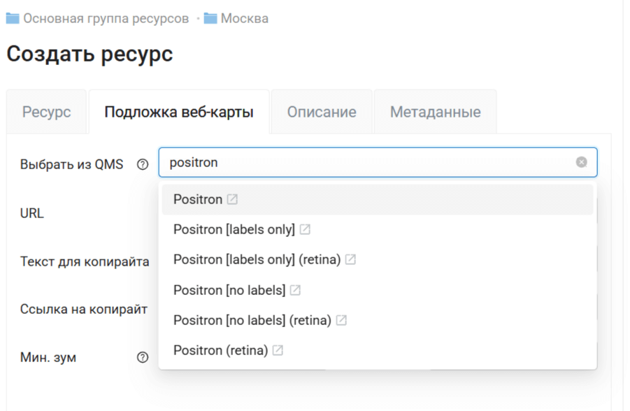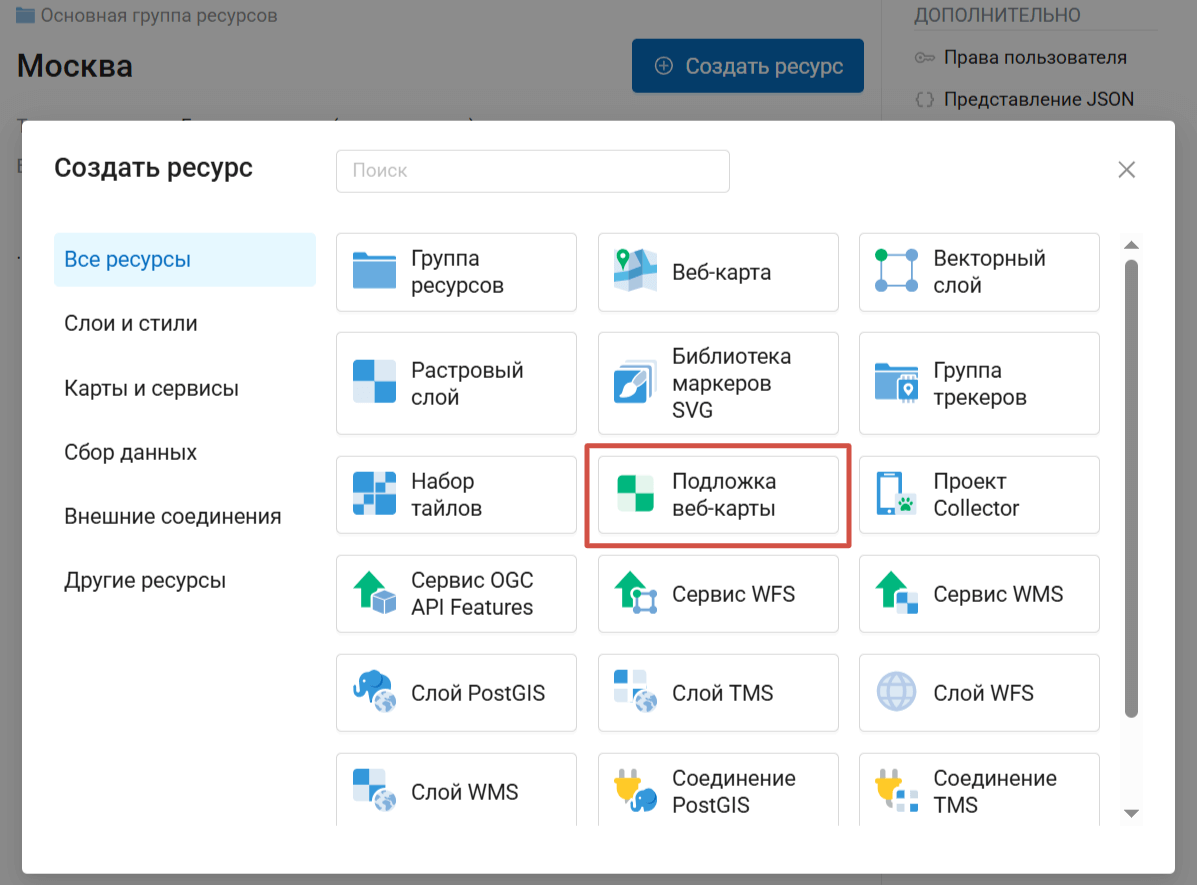 Вернитесь в группу Москва и выберите тип создаваемого ресурса Подложка веб-карты.