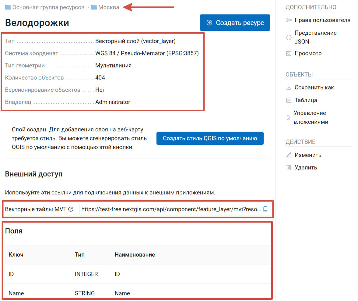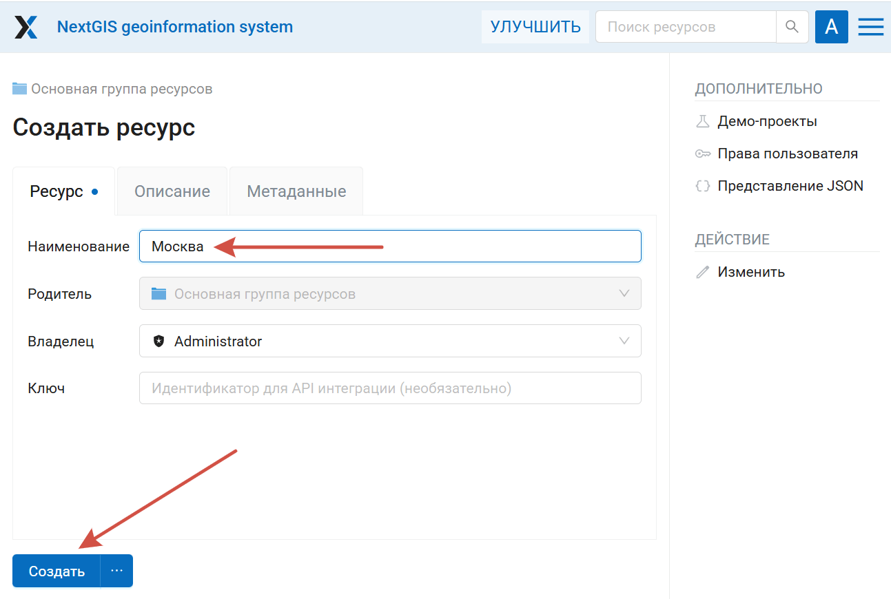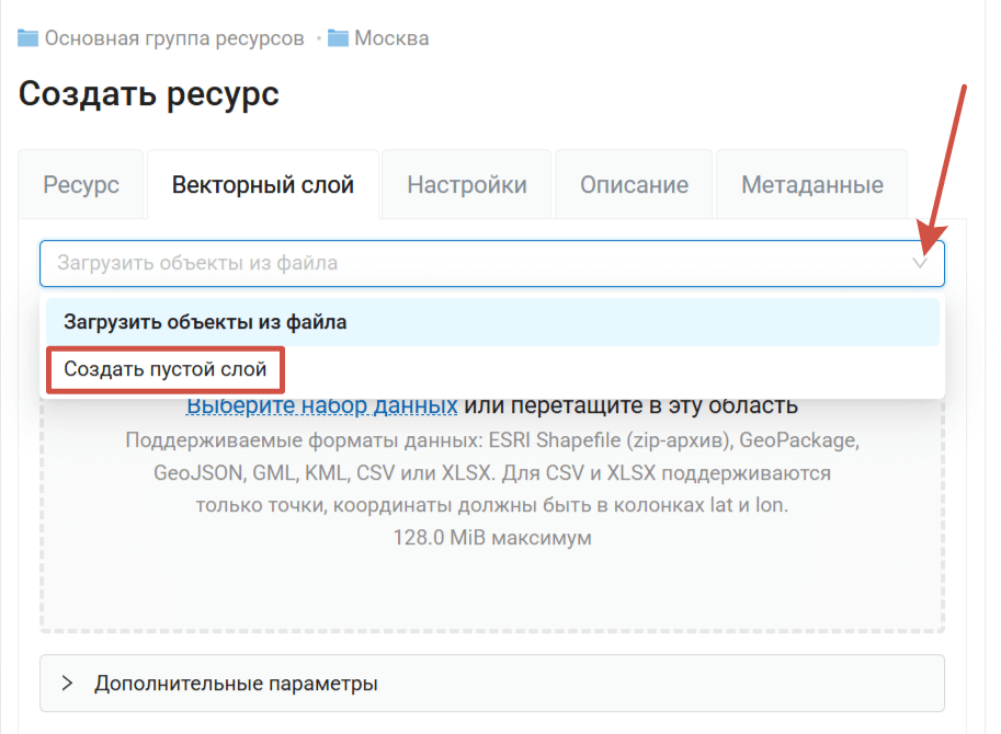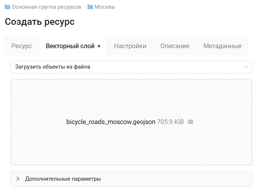 Вернитесь в группу Москва и создайте новый ресурс Векторный слой.