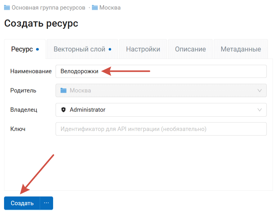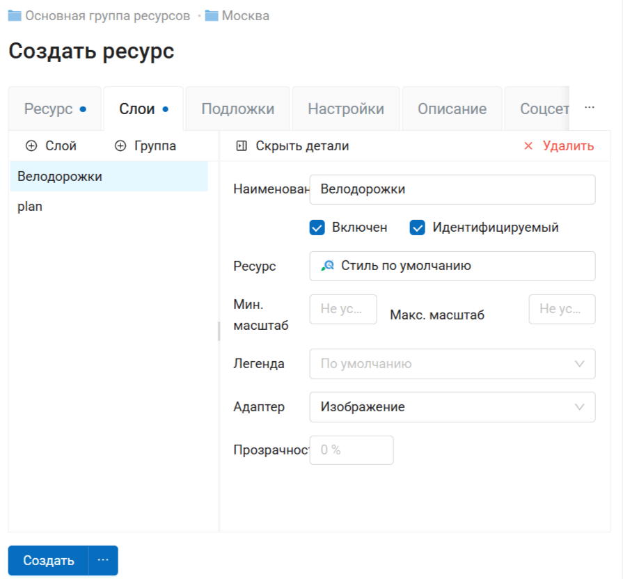 Переключитесь на вкладку Ресурс и введите наименование слоя, например, Велодорожки. Затем нажмите кнопку Создать.