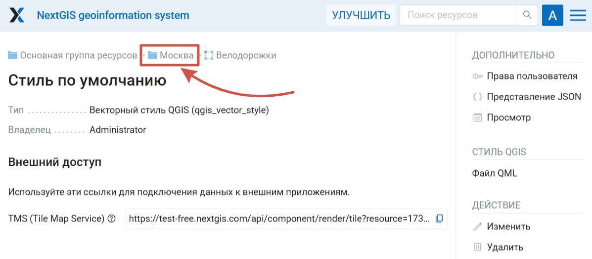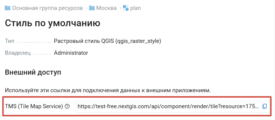 В разделе Внешний доступ вы найдёте автоматически сгенерированную ссылку, которую можно использовать, чтобы подключить стилизованные данные как тайлы Tiled Map Service, например, в QGIS. Подробнее об использовании TMS