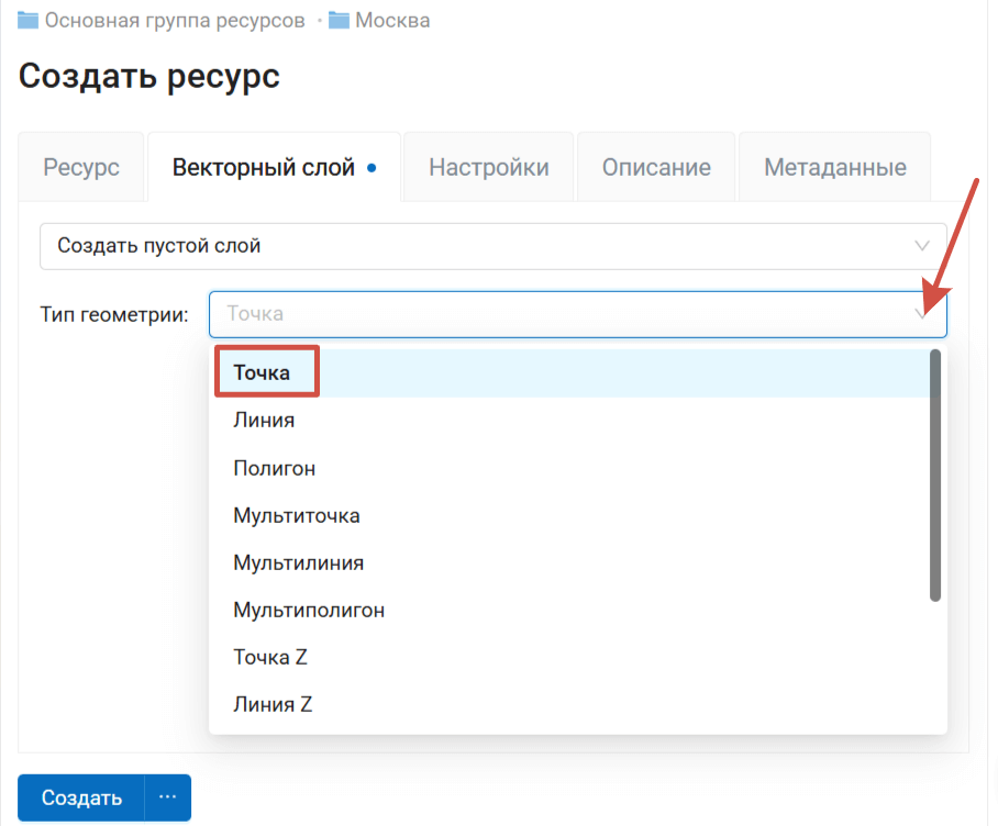 Интерфейс вкладки изменится. Выберите в качестве типа геометрии Точка.