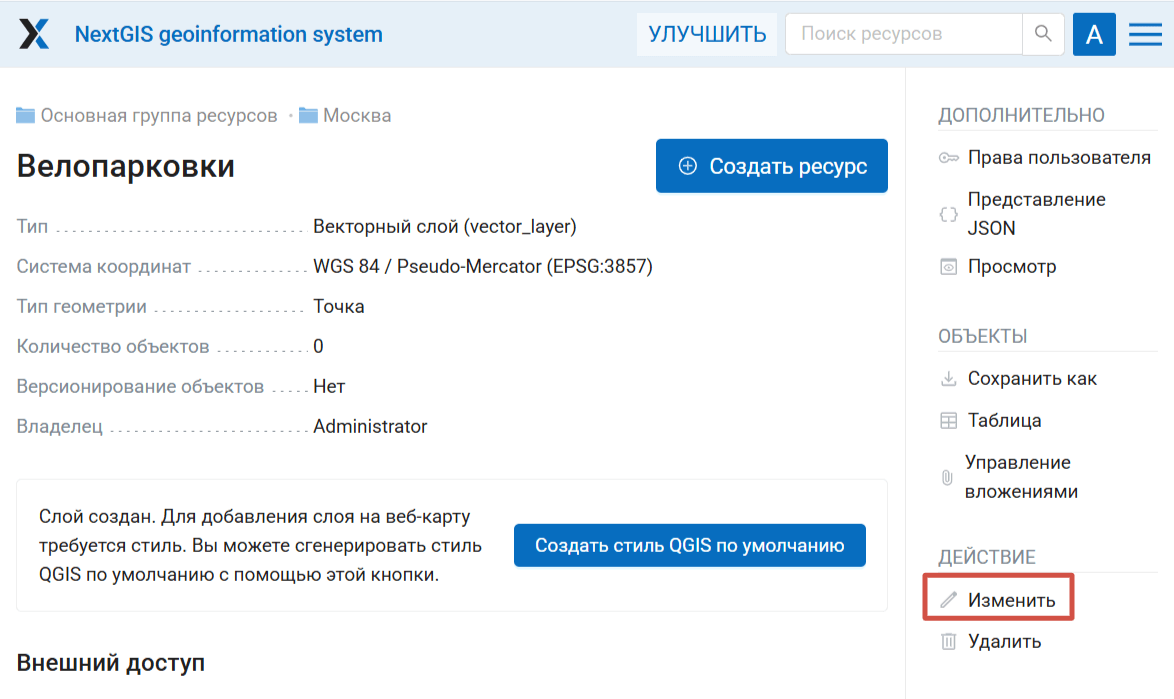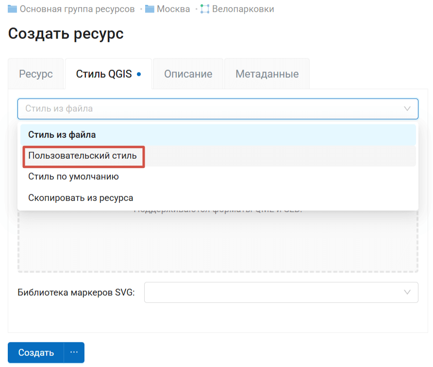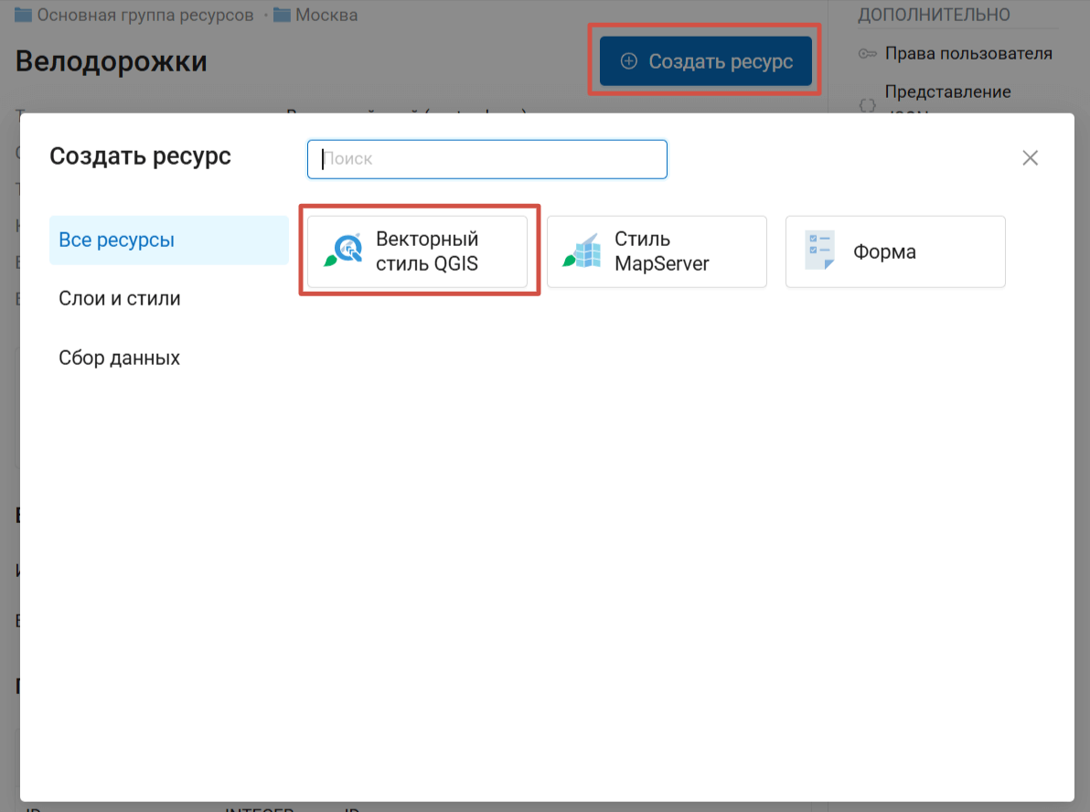 Теперь нужно добавить к новому слою стиль. На странице ресурса векторного слоя нажмите Создать ресурс и выберите Векторный стиль QGIS.