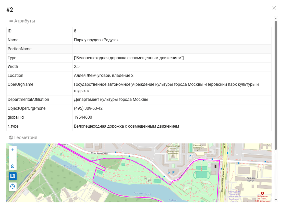В окне предпросмотра показаны свойства выбранного объекта, в том числе его атрибуты, данные о геометрии и визуализация поверх стандартной подложки.