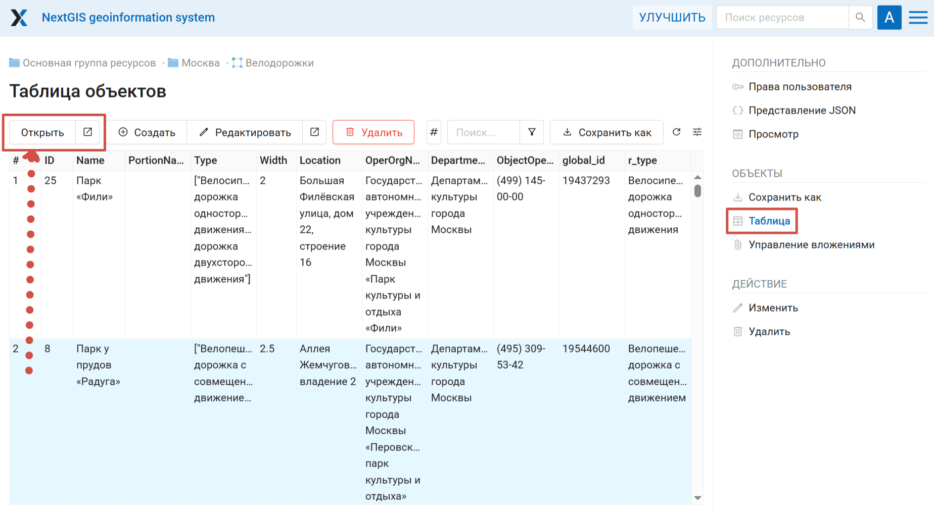 Через Таблицу объектов можно напрямую управлять векторными объектами. Вы можете просматривать и редактировать их как независимые записи базы данных, не используя карту или другие приложения. (Подробнее)