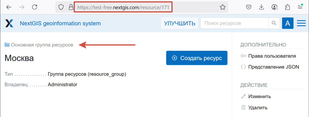 Группа Москва находится внутри Основной группы ресурсов, где мы её создали. Ресурс-родитель показан над наименованием ресурса.