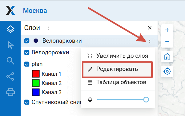 Чтобы добавить слой WMS на веб-карту вернитесь в группу Москва и нажмите иконку с карандашом