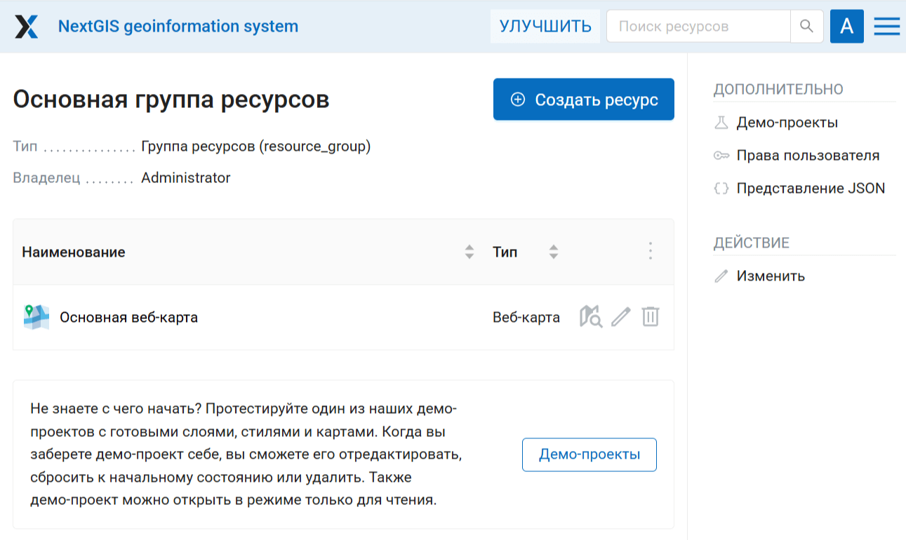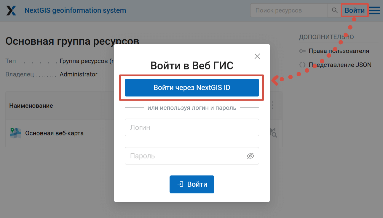 Если вы не видите кнопки Создать ресурс, вам нужно авторизоваться. Нажмите кнопку Войти в правом верхнем углу и выберите Войти с помощью NextGIS ID.