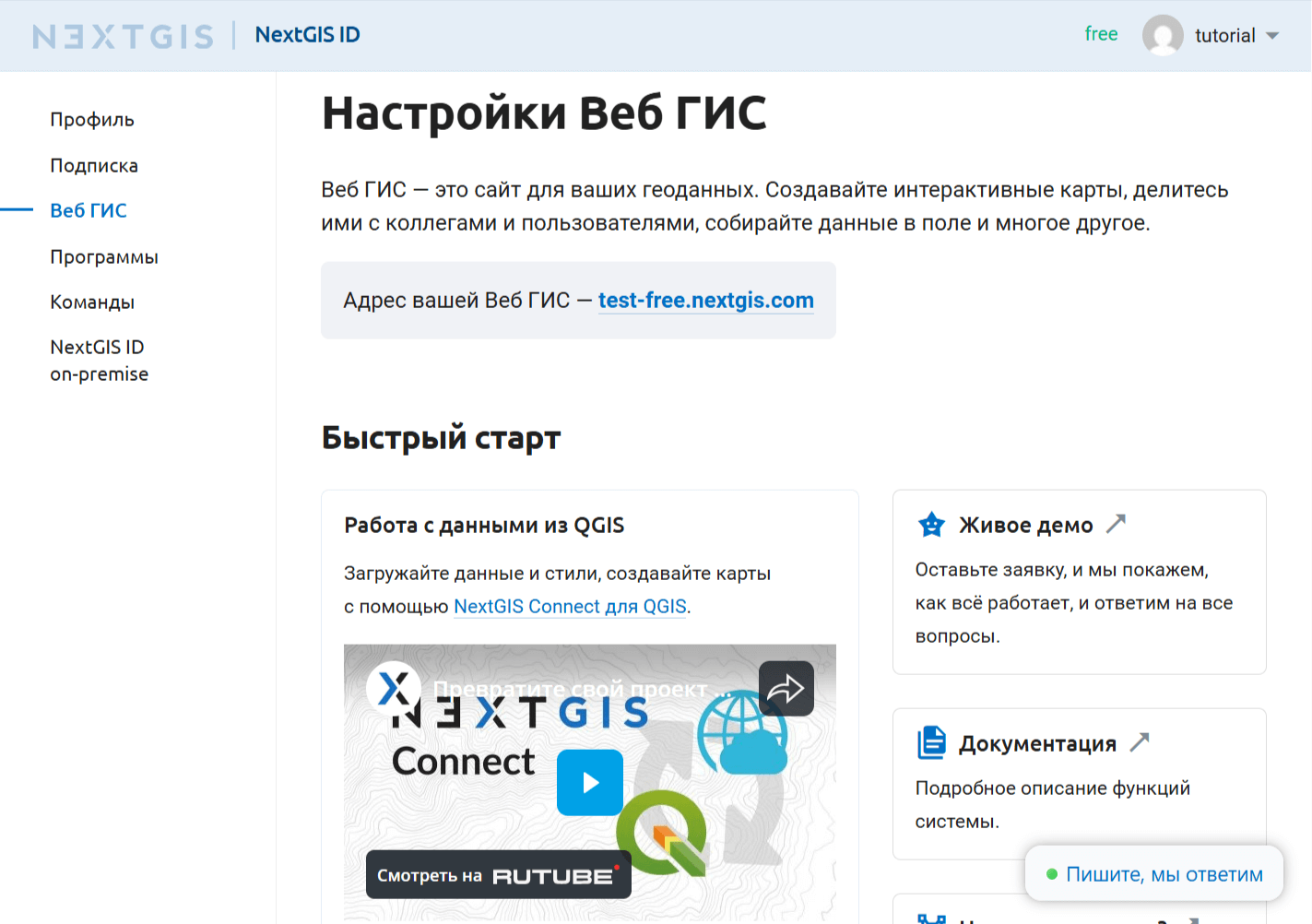 После регистрации откроется страница аккаунта. Выберите в меню слева пункт Веб ГИС. Придумайте название (мы в этом примере будем использовать test-free.nextgis.com) и выберите ближайший Центр обработки данных (Москва в этом примере). Затем нажмите Создать Веб ГИС.