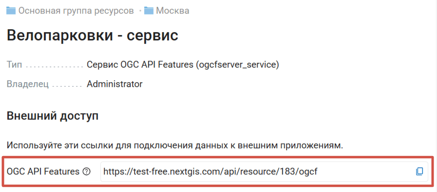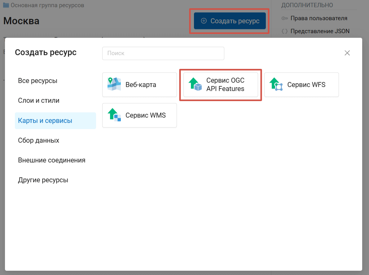 Опубликуем слой с помощью протокола OGC API — Features, чтобы его можно было редактировать в сторонних приложениях. Вернитесь в группу Москва, нажмите Создать ресурс и выберите тип Сервис OGC API Features.