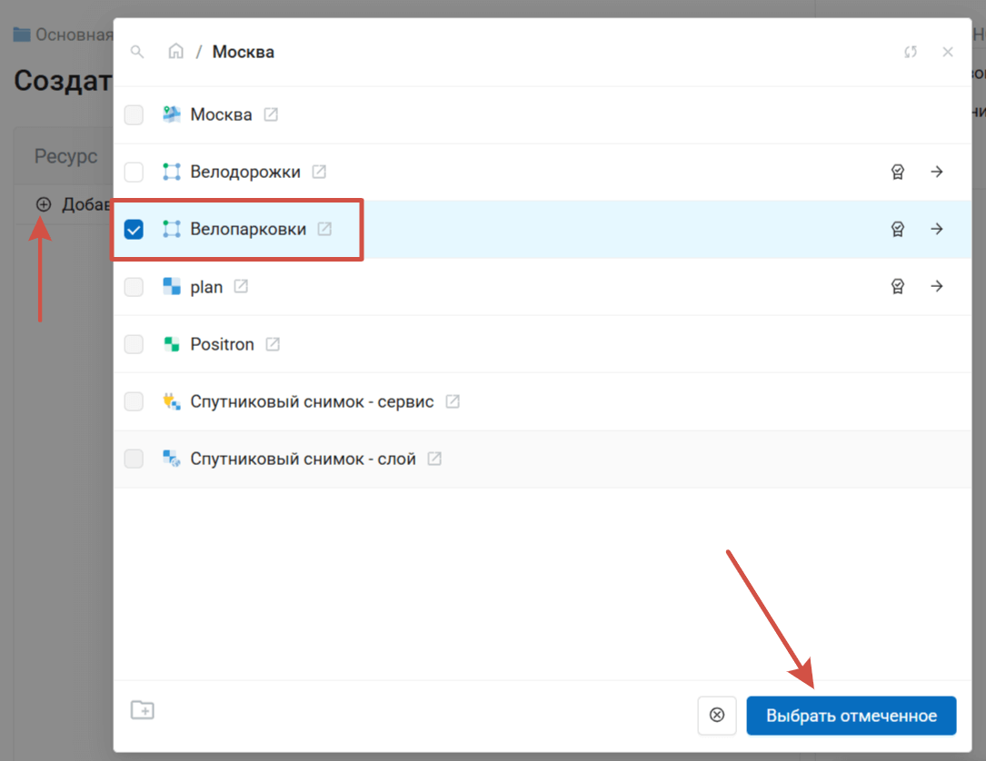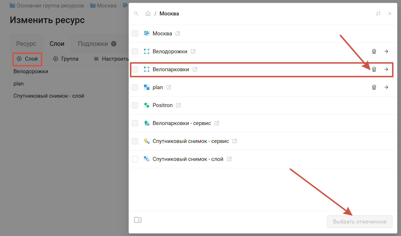 Первый подходящий дочерний ресурс справа от имени слоя. Нажмите Выбрать отмеченные, затем перетащите слой Велопарковки на самый верх списка слоёв.