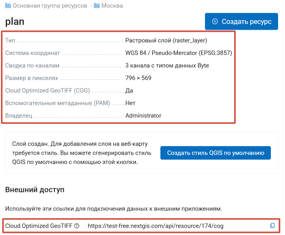В разделе Внешний доступ вы найдёте автоматически сгенерированную ссылку для доступа к данным Cloud Optimized GeoTIFF. Эту ссылку можно сразу использовать для подключения данных во внешние ресурсы.