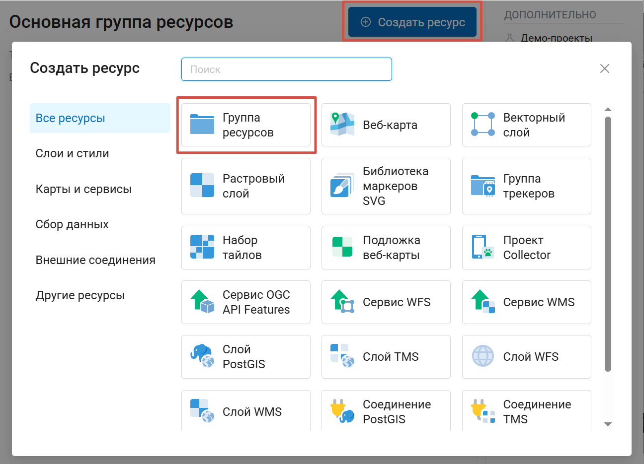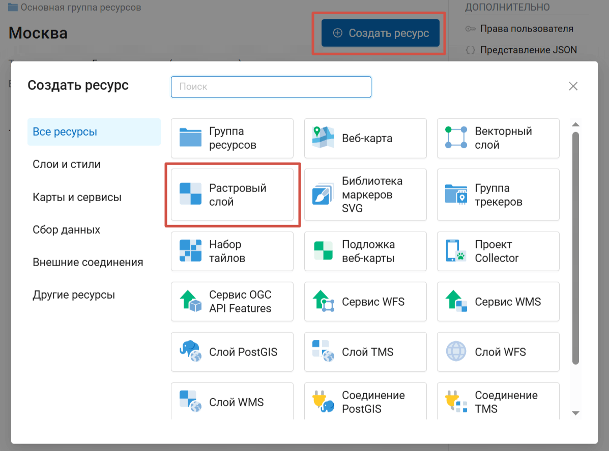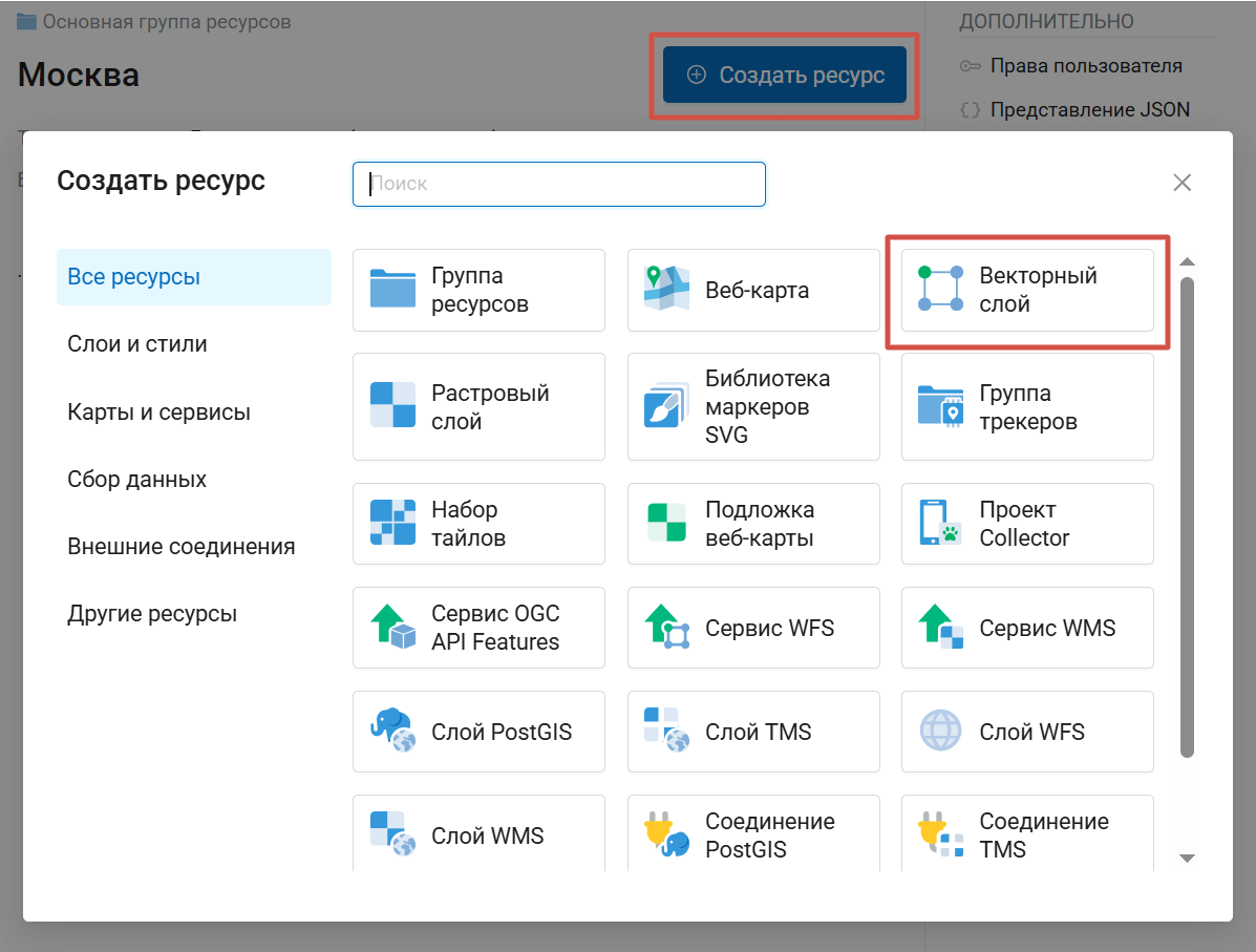 В группе ресурсов Москва нажмите Создать ресурс и выберите тип ресурса Векторный слой.