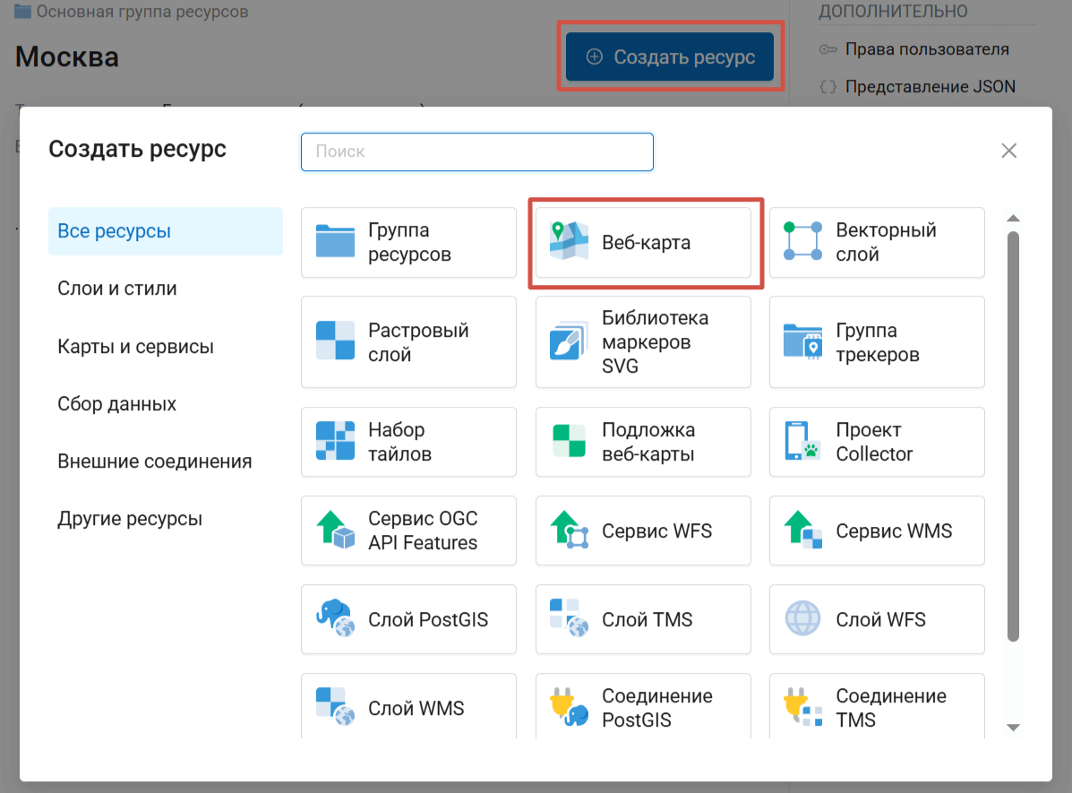 Теперь, когда у нас есть несколько слоёв с добавленными к ним стилями, можно опубликовать первую веб-карту. Вернитесь в группу ресурсов Москва и выберите в меню создания ресурса тип Веб-карта.