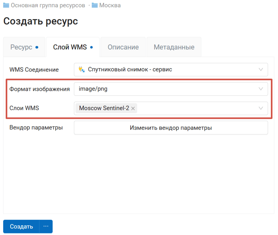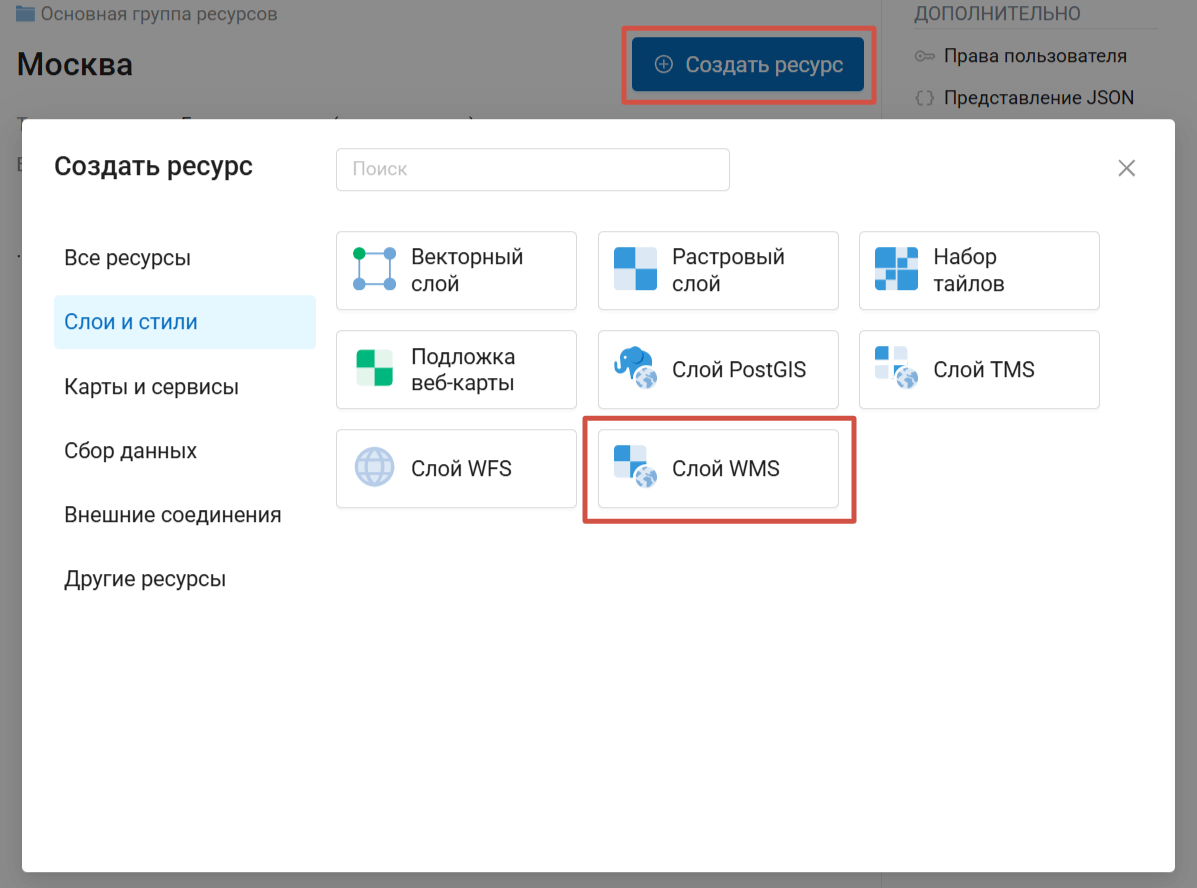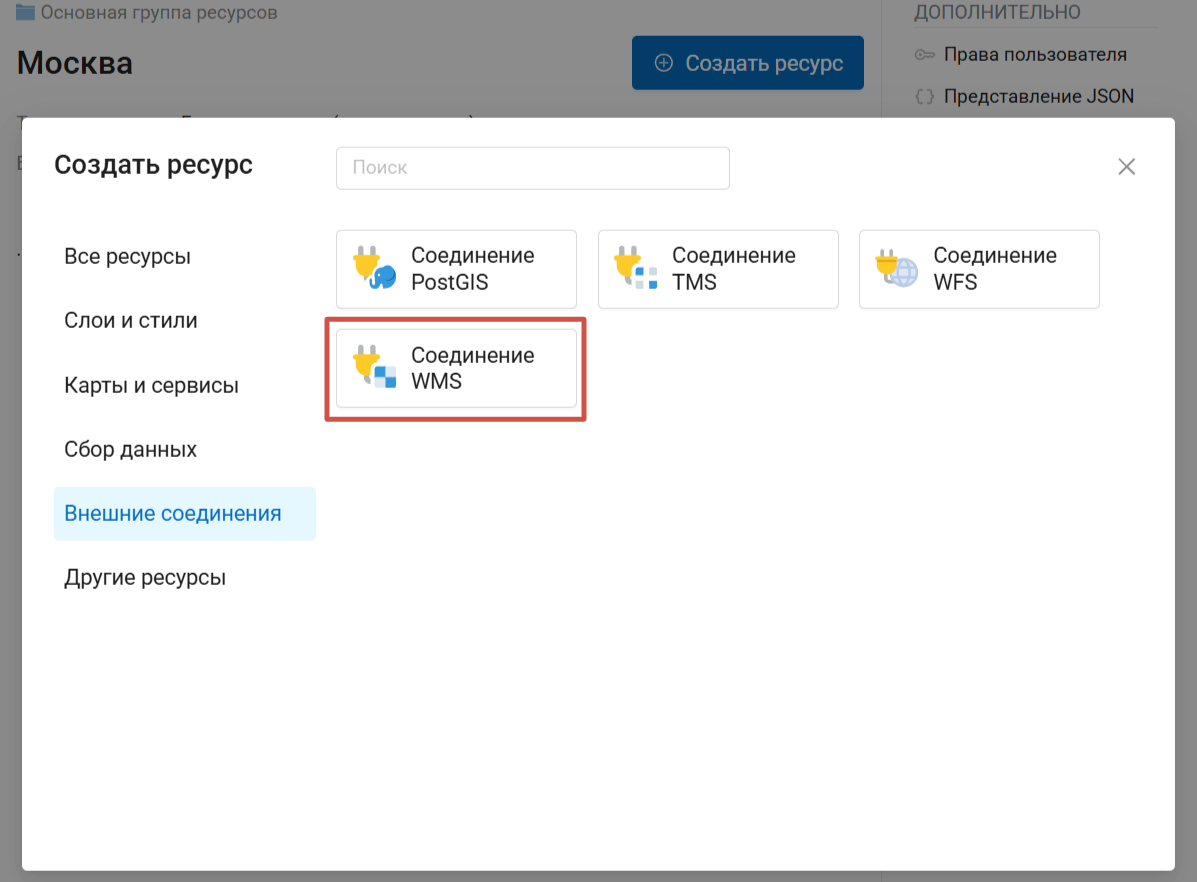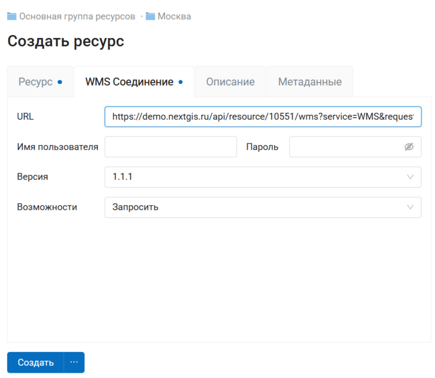 Вернитесь в группу Москва и создайте новый ресурс: Соединение WMS.