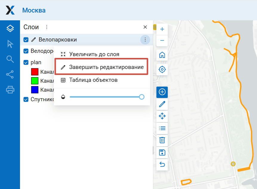 Теперь снова перейдите в контекстное меню слоя Велопарковки и нажмите Завершить редактирование.