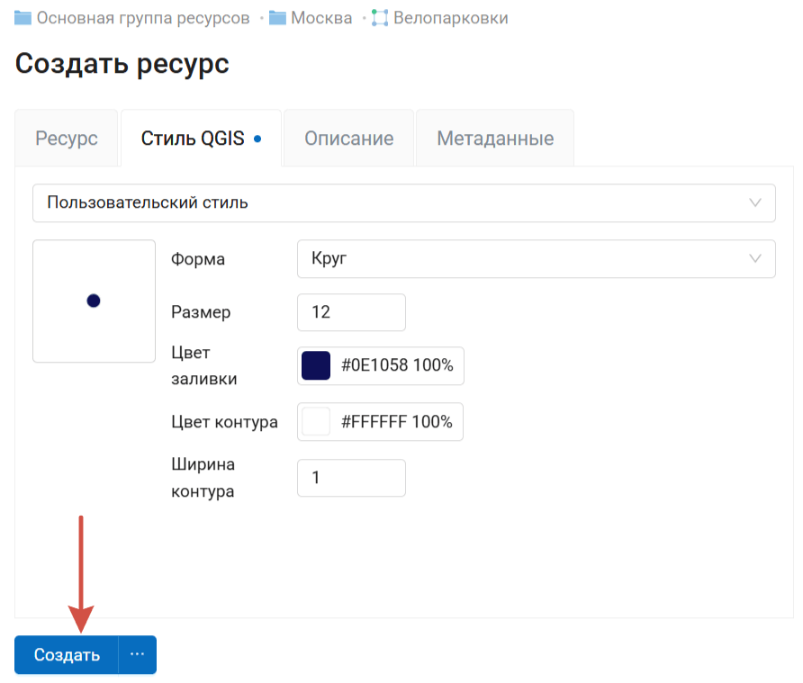 Здесь доступен конструктор простых стилей. Мы рекомендуем создавать стили в QGIS, но для быстрого добавления встроенный конструктор может быть полезен. Настойте в конструкторе значок в виде синего кружка с белой обводкой, размер - 12, толщина обводки - 1. Затем нажмите кнопку Создать.