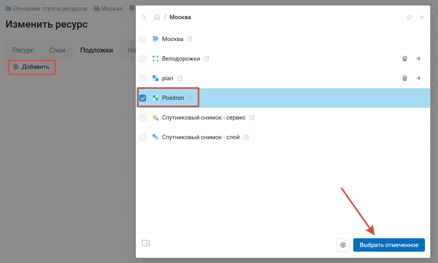 Добавить и выберите созданный ресурс подложки. Затем нажмите Выбрать отмеченное и сохраните изменения.