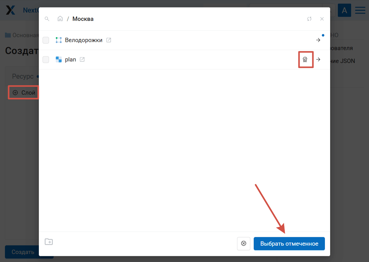 Слой и выберите слой Велопарковки*, затем нажмите **Выбрать отмеченное.