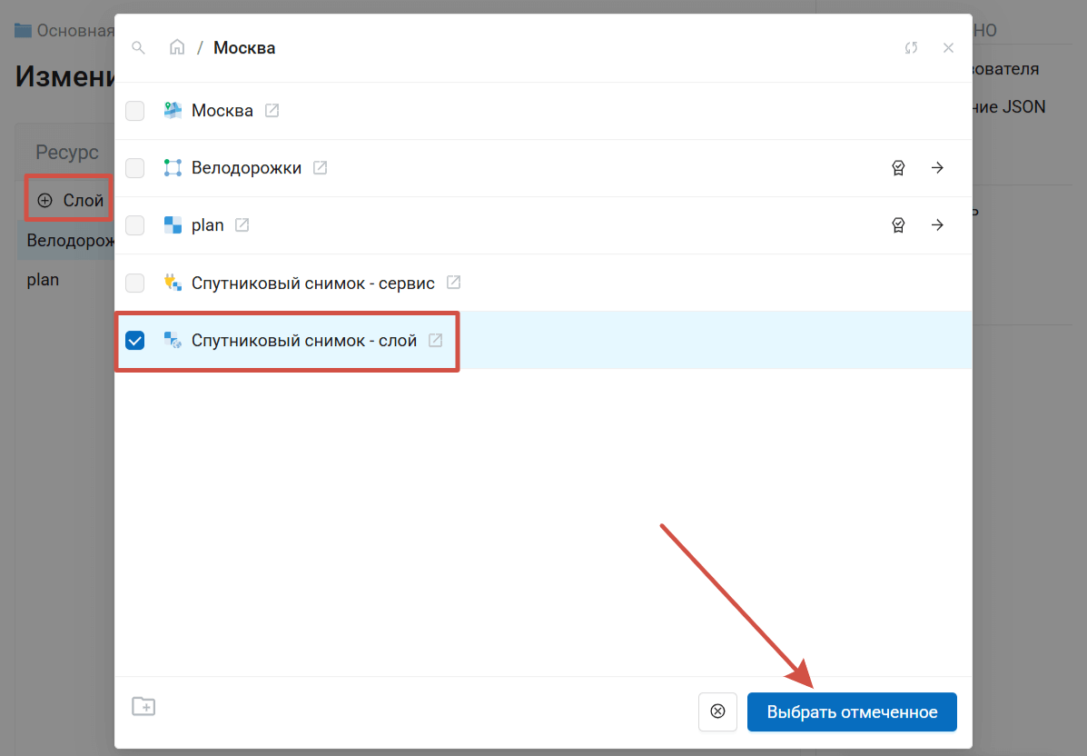 Слой, выберите Спутниковый снимок - слой и нажмите кнопку Выбрать отмеченное. Слой WMS добавлен на веб-карту.