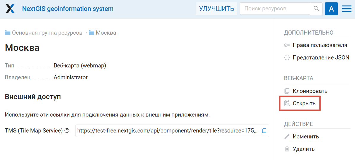 Для ресурса веб-карты существует особый режим просмотра. Нажмите Открыть в меню справа.