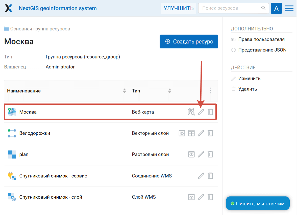 Чтобы добавить только что созданную подложку на веб-карту, вернитесь в группу Москва и нажмите иконку «Изменить»