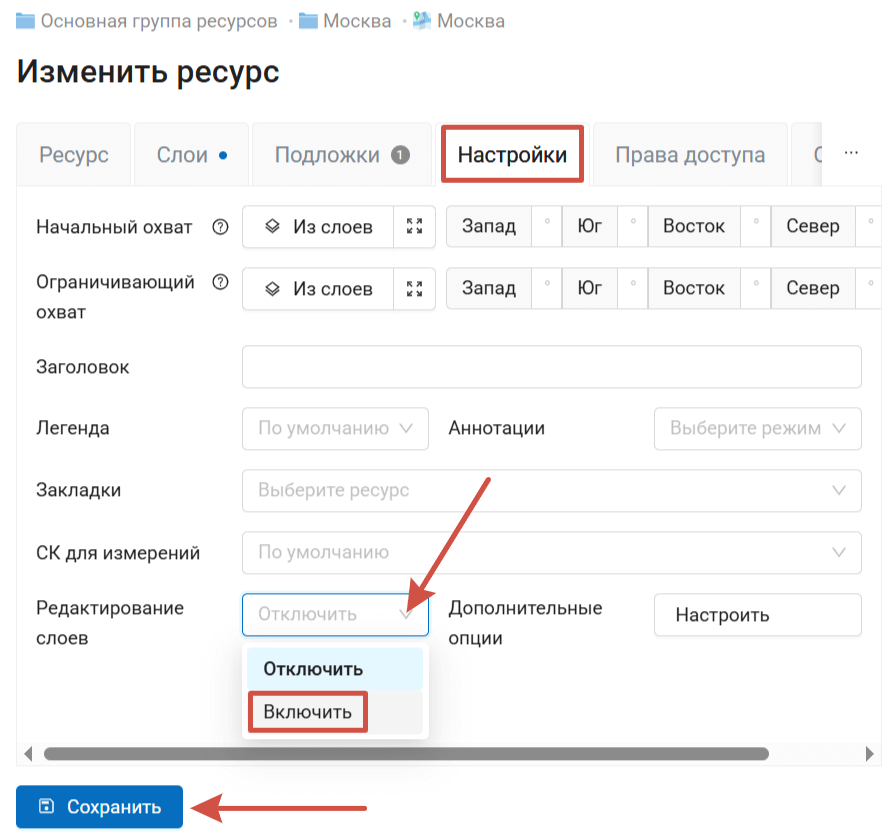 Далее перейдите на вкладку Настройки, найдите выпадающее меню Редактирование слоёв и выберите Включить. Сохраните изменения.