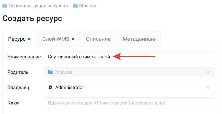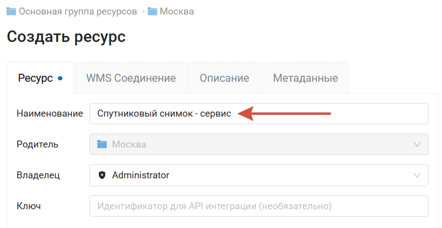 На вкладке «Ресурс» введите наименование: Спутниковый снимок - сервис.