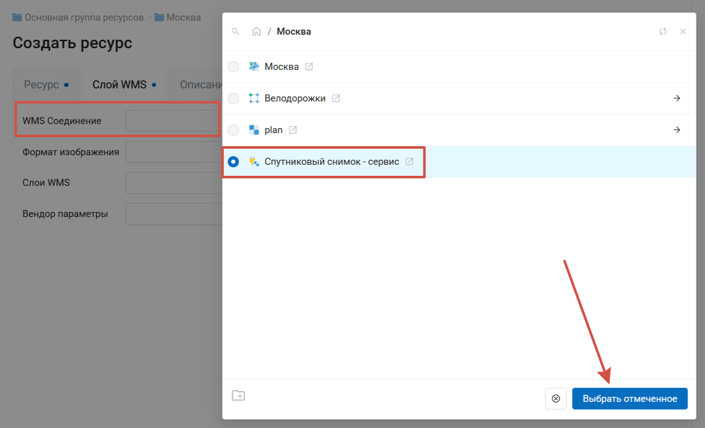 На вкладке Слой WMS нажмите на поле WMS соединение и выберите ресурс Спутниковый снимок - сервис, затем нажмите Выбрать отмеченное.