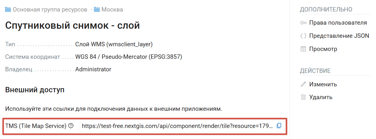 В разделе Внешний доступ вы найдёте автоматически сгенерированную ссылку, которую можно использовать для подключения данных в виде растровых тайлов. Вы сразу можете добавить эти данные в веб-приложение или настольную программу, например, NextGIS QGIS. Ваша Веб ГИС будет выступать в качестве прокси для WMS-сервиса.