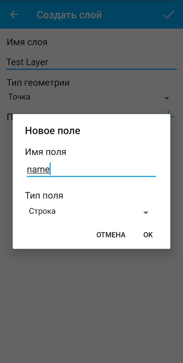 Можно добавить к новому векторному сколько угодно пользовательских полей. Для этого нужно нажать на кнопку «+» рядом с кнопкой «Поля». При этом откроется диалог создания нового поля:
