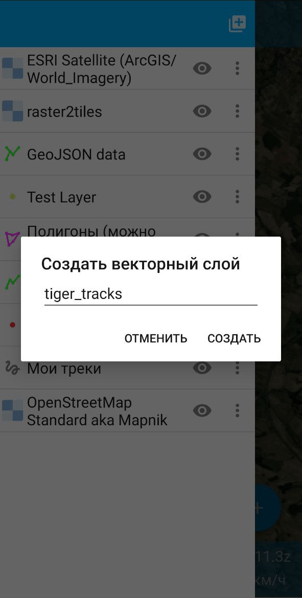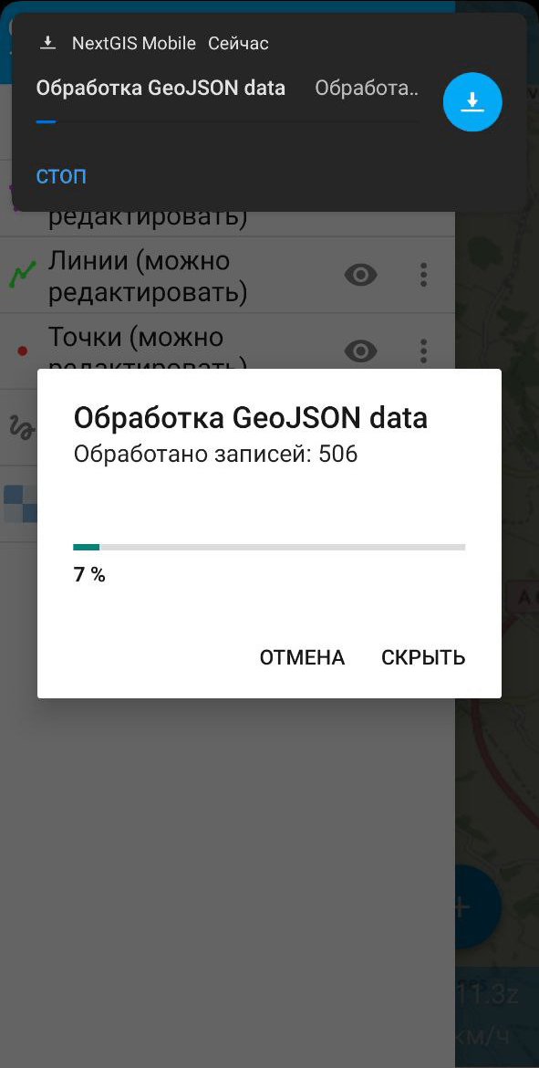 При нажатии на кнопку «Создать» начнется процесс загрузки данных и создания нового слоя. За его продвижением можно наблюдать во всплывающем окне и в панели уведомлений телефона.