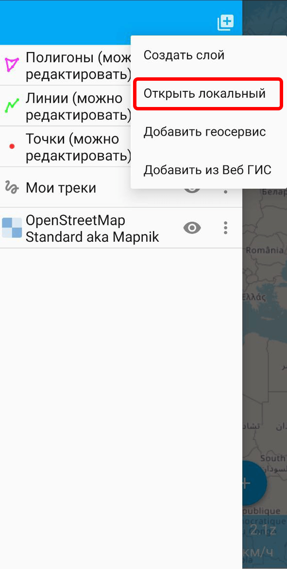 Можно добавить слой из файла, локально сохранённого на устройстве.