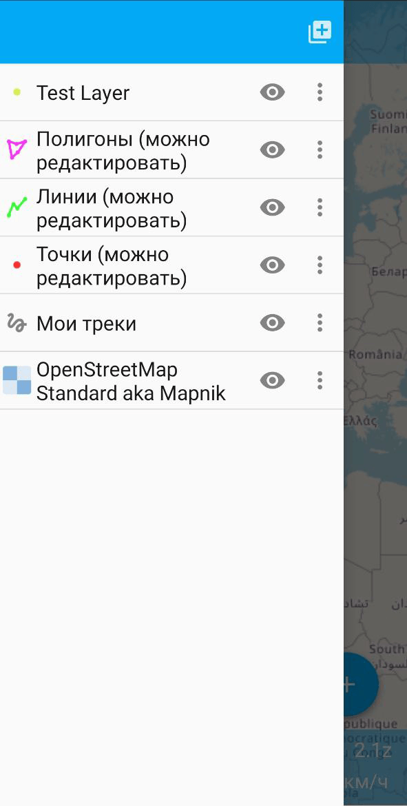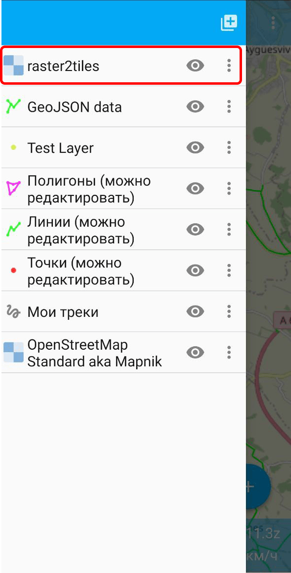 При нажатии на кнопку «Создать» начнется процесс загрузки данных и создания нового слоя (см. ngmobile_tree_layers_geo_pic). Результат создания слоя можно проверить в дереве слоев. В случае удачного создания слоя новый слой будет располагаться первым в дереве слоев.