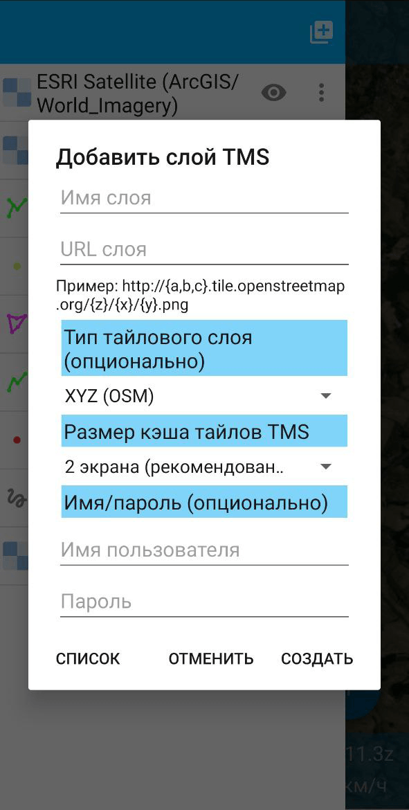 тип тайлового слоя: XYZ (OSM) или TMS (OSGeo);
