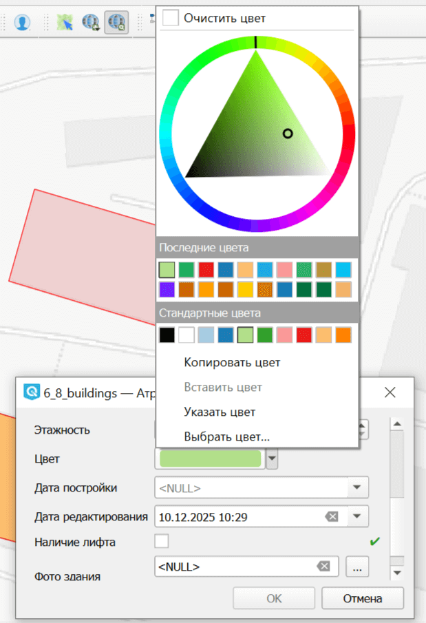 В форму добавляется стандартный интерфейс выбора цвета QGIS в двух вариантах. Нажатие на стрелочку вызвает более компактный диалог, на кнопку - более развёрнутый. Выбранный цвет отображается на кнопке.