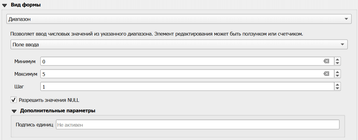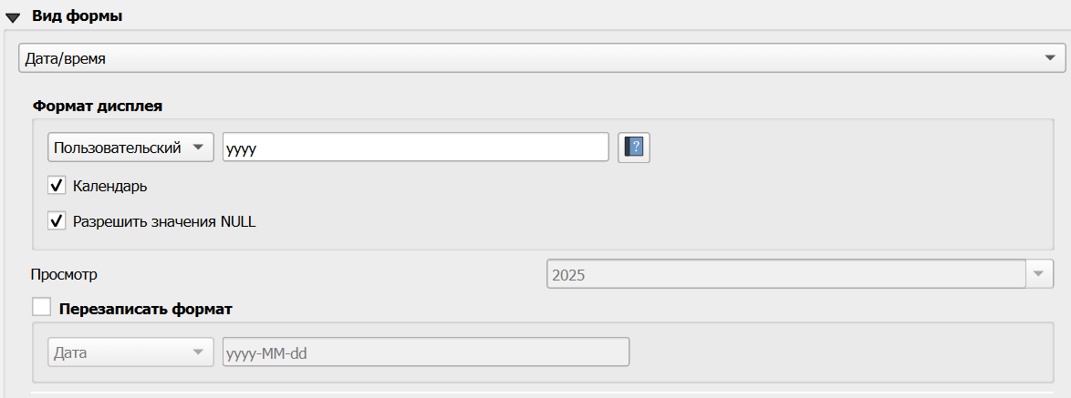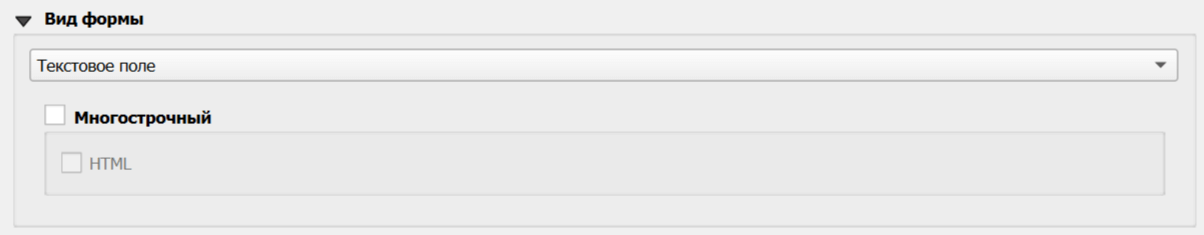 Вид формы - выбирается из выпадающего списка, доступные варианты и дальнейшие настройки зависят от типа данных.
