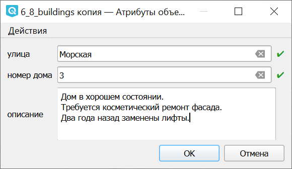 Флажок Использовать последние введённые значения атрибутов - убыстряет процесс, если нужно вводить подряд несколько объектов, у которых значение одного из атрибутов совпадает - например, адреса по одной улице;