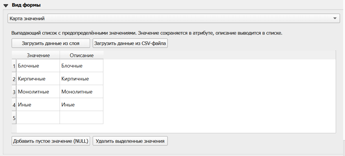 Список вариантов состоит из двух колонок, в первой - непосредственно то, что записывается в базу данных слоя, во второй - то, что пользователь видит в выпадающем списке. Колонки могут совпадать между собой, а могут различаться. Например, если поле должно содержать цифровой код или условное обозначение ограниченной длины, а пользователю удобнее ориентироваться по полному развёрнутому названию.